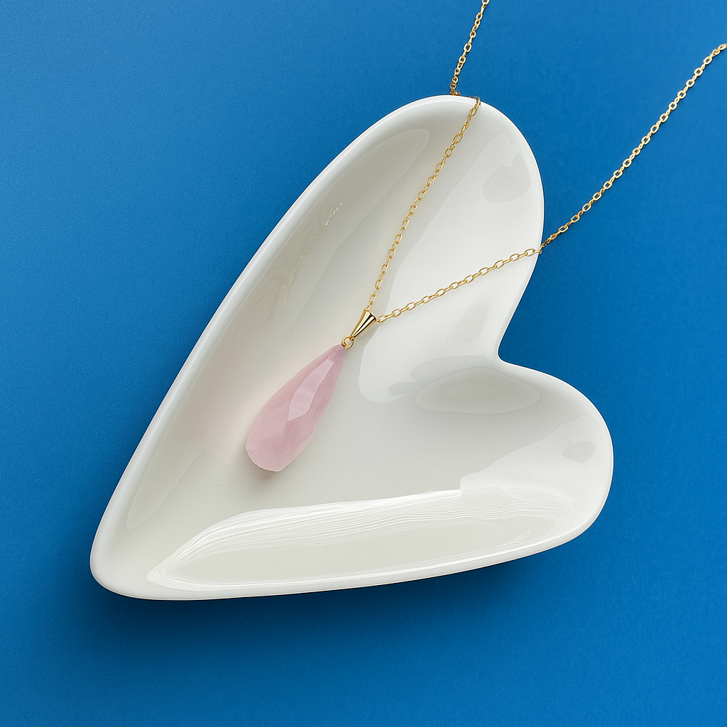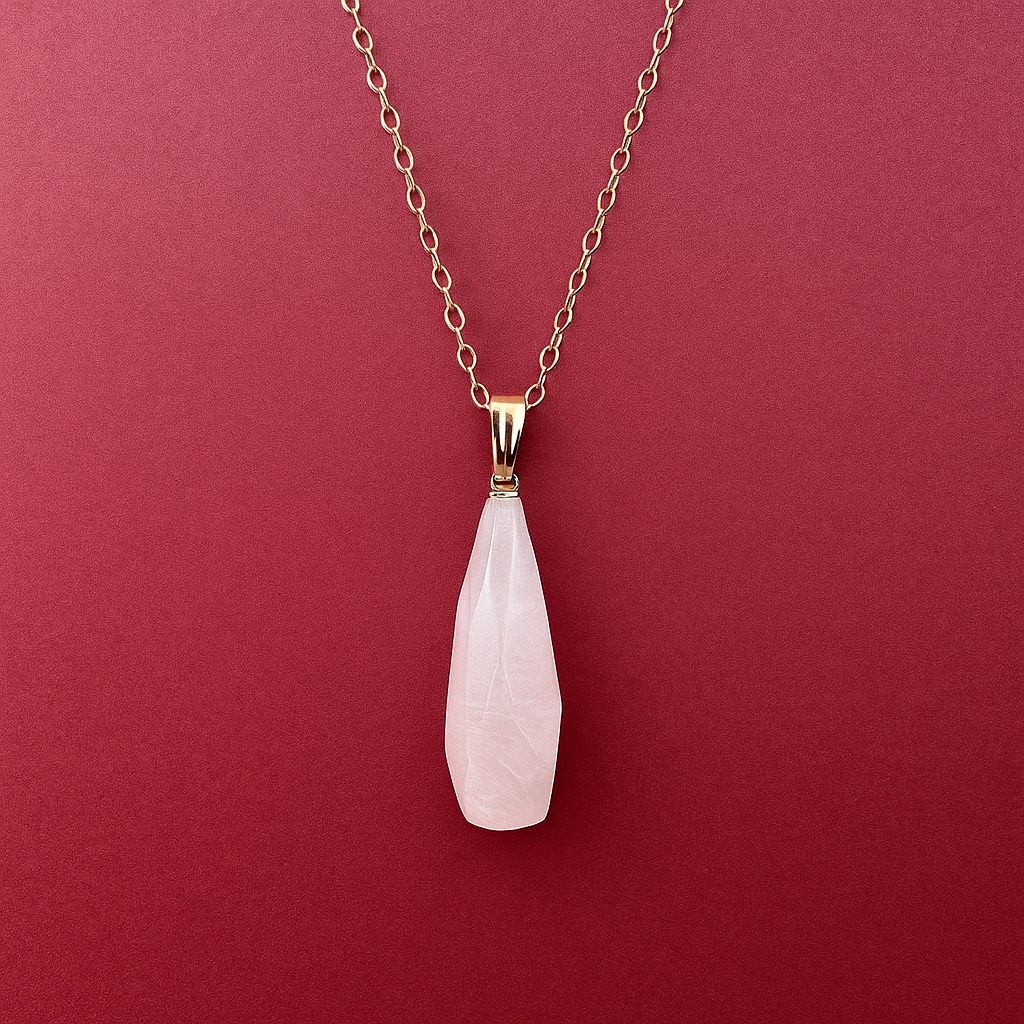The pendant features a polished, drop shaped rose quartz gemstone, radiating a soft and soothing blush pink hue. The gentle translucency of the rose quartz invites a subtle play of light.